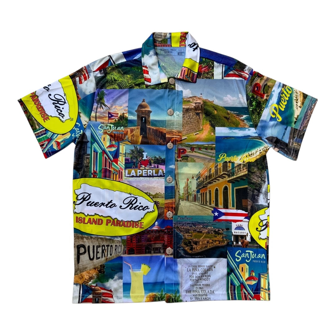 The Shirt design features a multitude of small photographic prints from historical places of Puerto Rico. These images depict scenes of San Juan, colorful buildings, landscapes, and landmarks. 100% Polyester. Made in Peru